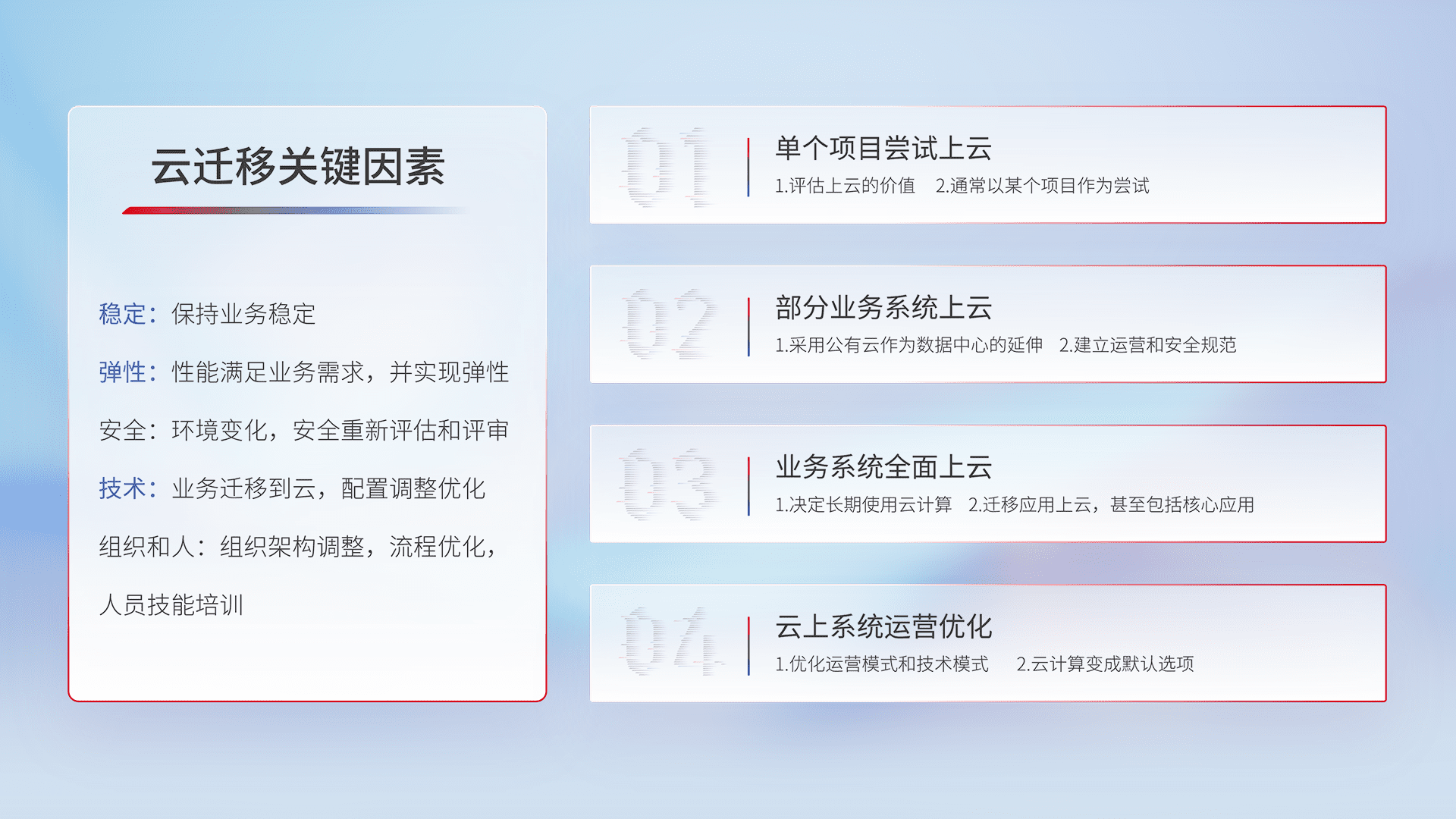 结合实际业务,,,从规划设计、、、、云平台选型、、云原生改造、、、、数据迁移、、集成交付,,,,迁移全过程为客户识别最佳上云路径,,,,做好风险识别管理,,,设计网络架构、、、、身份权限、、、安全审计合规、、操作审计、、、、日志审计、、、监控告警策略、、多站点容灾设计等,,,,对云上基础设施进行整体规划,,提升IT治理水平,,,以满足弹性、、、、高可用、、、、高性能的需求。。。