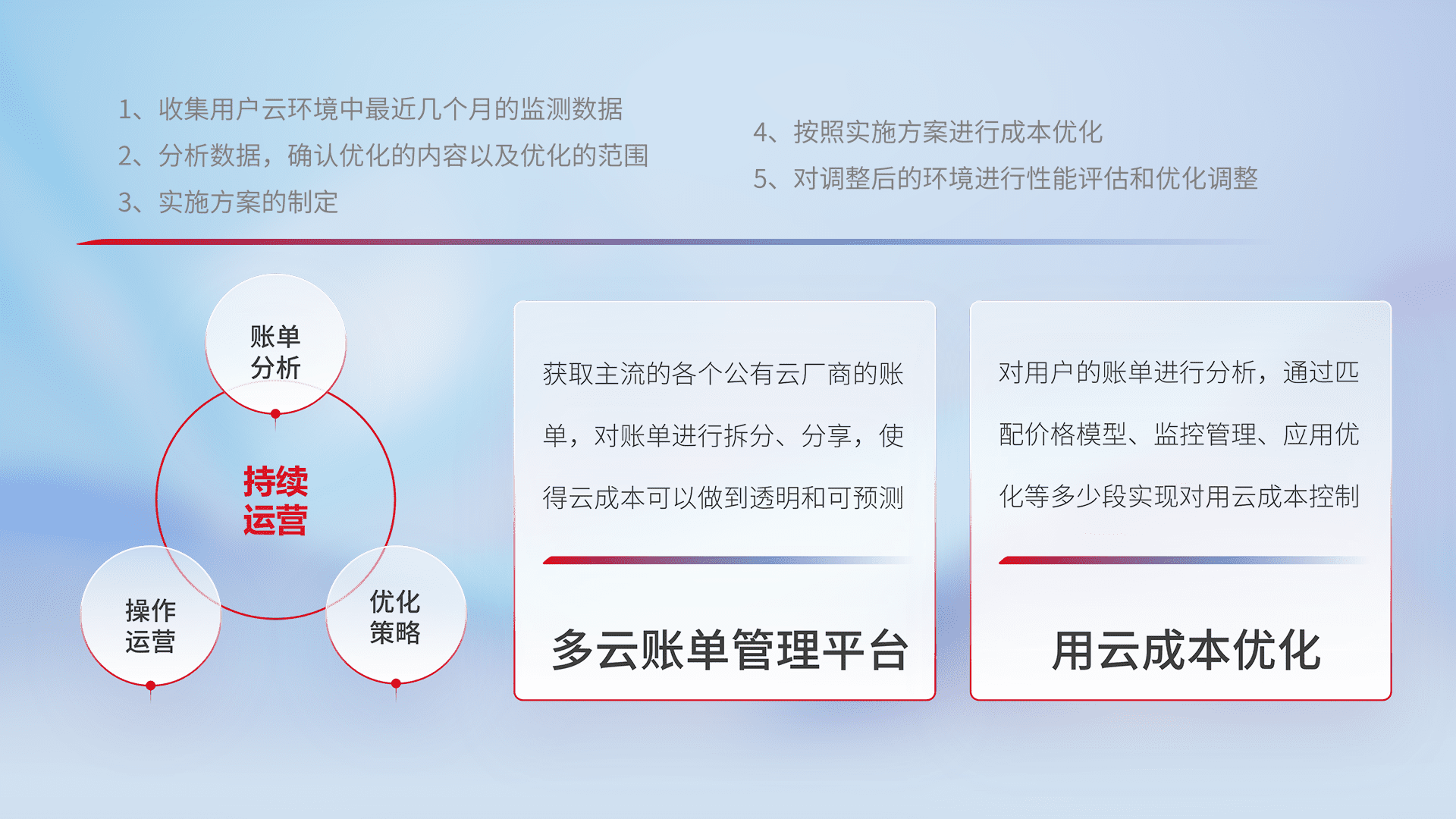 通过多云纳管,,以统一的资源数据模型把客户的云资源进行抽象和封装,,,,进而实现对多云资源的统一操作,,保障云资源管理的可靠性、、、稳定性与可用性。。。。量身定制化运维内容,,配置、、开发运维、、补丁管理、、备份、、、监控、、、、认证和访问管理、、、审计和日常巡检等,,,,保障在用云过程中的可靠度,,,,稳定度以及高可用率。。。